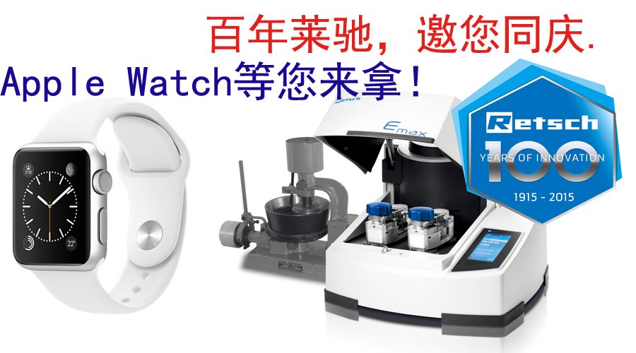 为庆祝德国Retsch(莱驰)一百周年,我司将在全国范围举办2015年度抽奖庆祝活动,凡在今年参加我们举办的巡回技术交流会,行业会议,或者展会填写反馈表的客户都有机会参与抽奖,也可以上我们的官网或,点击抽奖页面,答题参与抽奖,奖品为苹果Apple watch 。